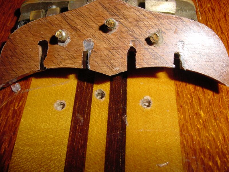 Hello, when I opened the door to my music room yesterday I had a bad surprise. The strings were hanging down on my 1976 Series 1 and the bridge was on the floor. The only explanation in my opinion is that the neck had moved and pulled out the bridge from the wood. As you can see in the pics the screws are broken. Probably the movement of the neck was caused by the heating of our house which we started some days ago. So what to do? How to put the rest of the screws out of the wood to get new screws in? Drilling new holes? How long should the new scres be without damaging any elecrtonic? Any advice is highly appreciated.  Harald from Germany (I hope my english is correct)