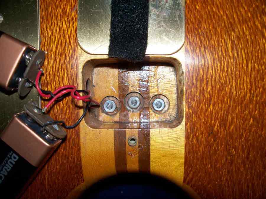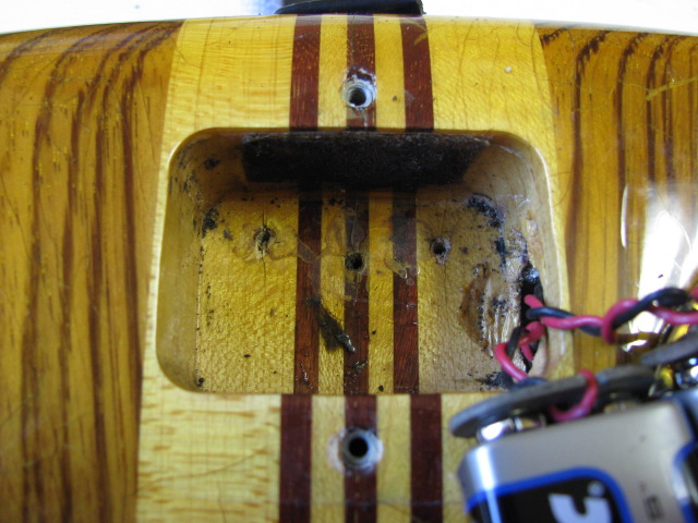 Well, I read this thread with a little fear and trepidation. During my 'cleanup' of my SII this summer I remember removing the tailpiece screws and noting they appeared to be cut off. I didn't think any more about it until this read and then got worried. So I disassembled the tailpiece again and verified that they were indeed truncated. An ill feeling came over me as I poked in the holes with an icepick that revealed shiny metal. Uh oh. But then I remembered the battery cavity was directly underneath the tailpiece on the back. I opened it up and was relieved to find three clean holes for the tailpiece screws and little tiny scratches on the back battery. Sometimes it is better to be lucky than good! A pic is worth a thousand words dept. -