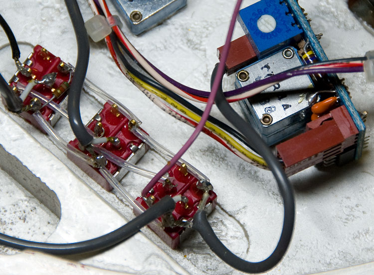 The three switches should be on/off switches for the three pickups. The two that are three way may have a treble boost in addition to on/off. Remove the control cover on the rear. You should see some little blue square boxes with white round adjusting slots on top; these are trim pots. If there are more than two, then you may find that two of these are in proximity to the two three way switches; if so, then these two pots control the amount of the treble boost.