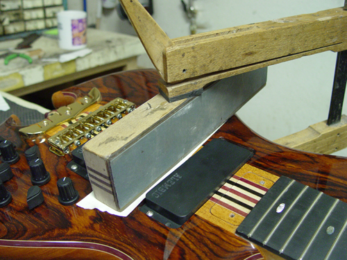 If the pickup isn't flush without clamping, then you should clamp away. Notice how James puts a large block and a protective layer of carpet tape (or thick paper) over the humcanceller.  According to James, that same (gasp) blow from a rubber mallet will still knock this install loose for repairs like refinishing. The key is to use very little adhesive, but still enough to hold it fast.