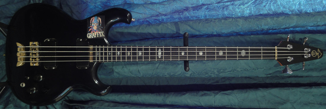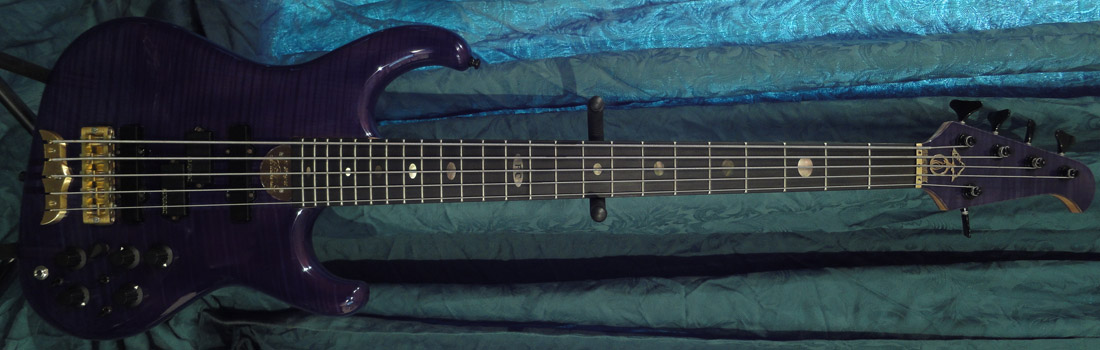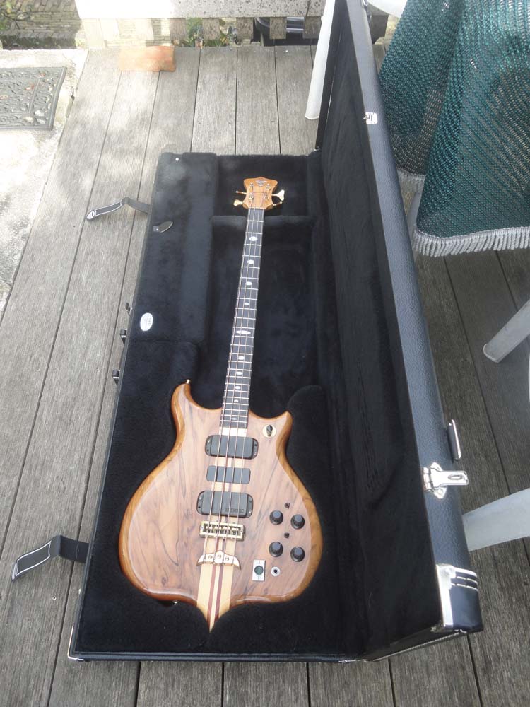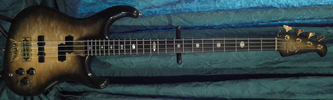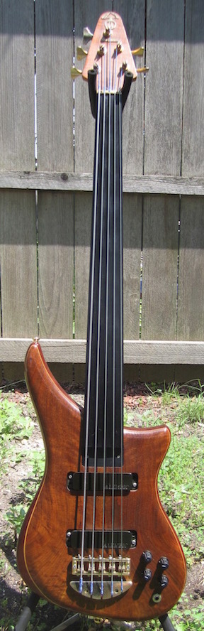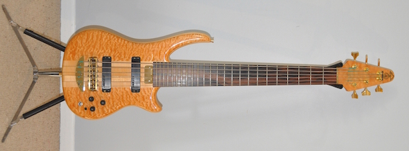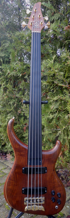 '06 Custom fretless, Mahogany body with Spalted Maple top, Maple neck with Walnut pinstripes: 3955 gram, 8.7 lbs (sold)