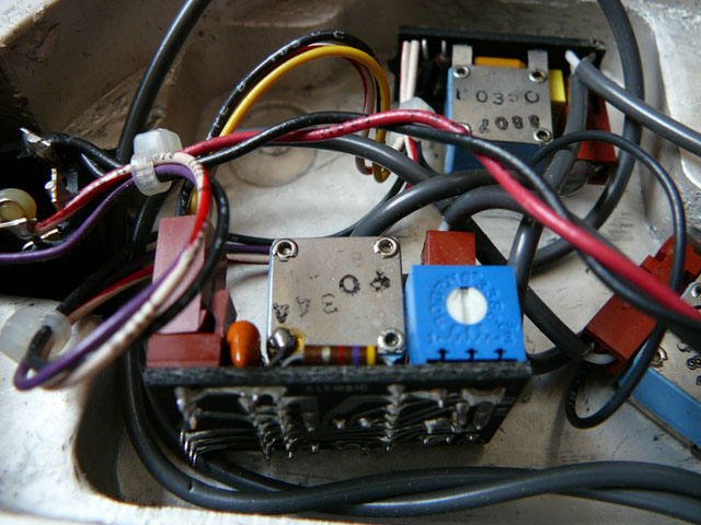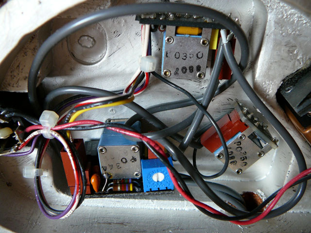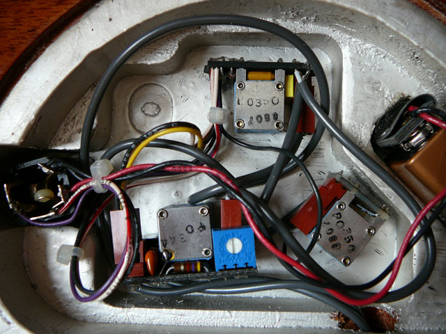 The 2 volume pots each have a pickup connected to it by brown friction block. These are top (bridge) and right (neck) in the photos. Neck board has 2 captive leads to the bridge board (grey multicore and a single black).  The filter board is the one with the blue/white trimpot on and this takes a 3-wire and a 2-wire friction block feed from the bridge volume.  All the other wires (all from the bridge board + battery) go onto various points on the 4-connector jack switch.  By the way, Mica, I notice an extra rout top left - would that be the position for the Q switch if fitted? or an extra pot?