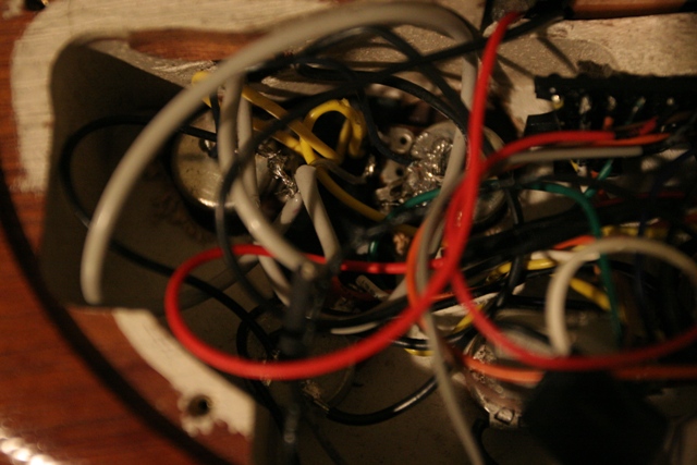 Well, it still has the alembic PU's, at first glance anyway.  It might be helpful if you know some things about soldering and could help me fix it.  Looks like all the stuff is there, red cord, yellow cord, black cord, big grey cord; its just all messed up and, from the looks and sound of it, the person who had it before tried to change the orientation, perhaps.  Still too early to tell