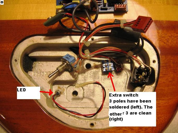 From what I can see in your picture it looks like the previous owner replaced the on/off switch with a switched 1/4 jack. I know of a person who did this because he would forget to turn the bass off and drain the battery. By having the power switched by the jack he knew the battery was disconnected every time he unplugged. In addition the LED adds some additional drain to the battery.