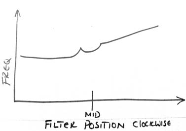 I do have a bit of a concern about the way the filter is working as the sweep of it does not seem very linear or logical, ( see my rough interpretation below), and the fact that the volume drops off very significantly as I filter out the top end by turning it counter clockwise.