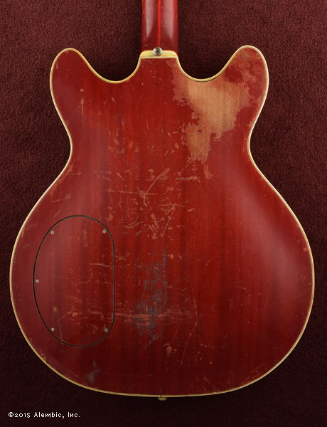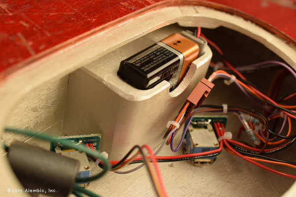 HGR pickups in custom 5-ply pickup rings that are slightly inlaid in the top, 20th Anniversary electronics, new tailpiece, bridge, block, and nut. We were originally going to cover the thumbrest holes with the treble pickup, but it was pretty far from the bridge. So we moved it closer to the bridge and filled the little holes with Bloodwood dowels.