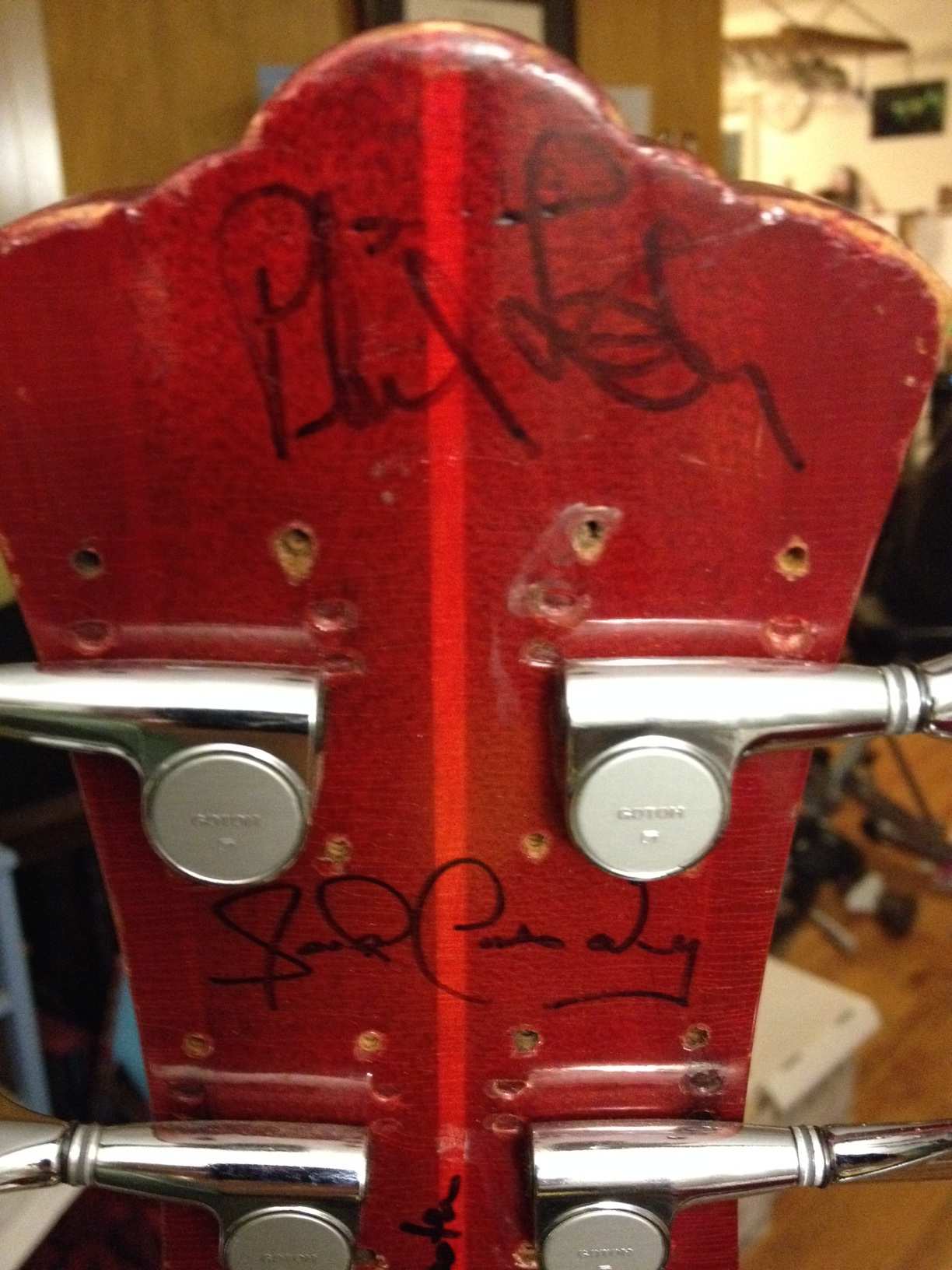 I like signatures on headstocks, although I think I need to do something about the wear. It's the one thing that keeps me from considering getting the headstock replaced or rebuilt. Not that it needs it, although the plastic front is a bit shrunk.