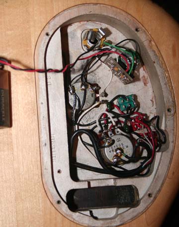 Okay - I opened it up - how sweet that the screws are NOT wood screws!  Here are a couple of the cavity; I can certainly take better shots as these were done quickly, or email larger ones if need be.  While I do need to replace the battery and restring it, the bass sounded very nice through my Boogie.   I'm not quite sure what I am dealing with regarding the pots.   P/U selector (pan) volume some kind of preamp-boost/cut (dual).  The two-way toggles were not very definitive and the three way didn't seem to do anything.  While the Barts are okay, I'm really leaning toward replacing them with the originals; any idea what my cost would be, and, if there is somewhere in Minneapolis/St. Paul to have it done, or do I need to send it to CA?  I am very curious to hear what others have to say about the difference between the two.  Thanks again everyone - all your input is much appreciated!  Paul