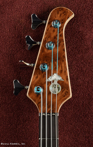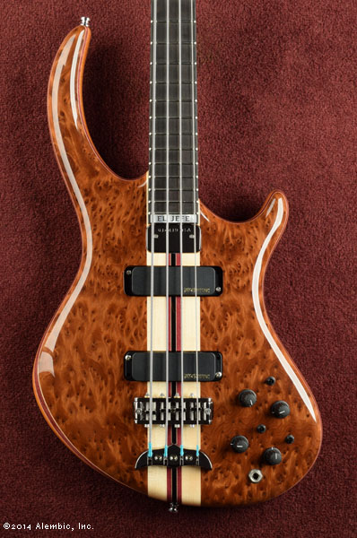 I set out to create my ultimate go-to bass, with features from various basses I've loved over the years - 32 scale, thin neck, twin pickup, contoured body (coopered in Alembic-speak, like a Warwick Thumb or a Spector), beautiful woods, not too heavy, LEDs, and some other goodies. I originally started my quest by trying to order a custom from my previous go-to, Warwick. After several months of trying to get the salesman to verify options and pricing on a custom Dolphin, I gave up. I then tried to get a custom Moses graphite neck for my Warwick Thumb, but the neck they delivered to me wasn't even close to my specs. It was only then they admitted they couldn't make one to my specs. Disillusioned by empty promises and inept service, I went to the builder I should have started with in the first place and called Alembic. I already had an Exploiter and an SCSD, and knew that Alembic would be able to fulfill any dream I had.