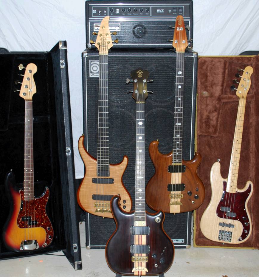 Here you go... meet the family from left to right: Fender 62 reissue, 02 Orion 5, 85 Distillate, 83 Spoiler, and my own original Frankenbass, assembled from various new and used parts including: Ash body, Badass bridge, EMG PJ active pups, Hipshot Dtuner and a 80's Squier Bullet maple neck. Last but not least, my Ampeg SVT 8x10 stack. I recently got these Alembics to replace a couple of basses not pictured. I love the Alembic sound and craftsmanship and plan to keep 'em forever. By the way, the Distillate is a birthday gift for my Stepdad, and he's gonna love it.
