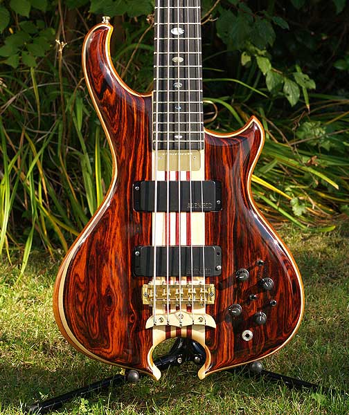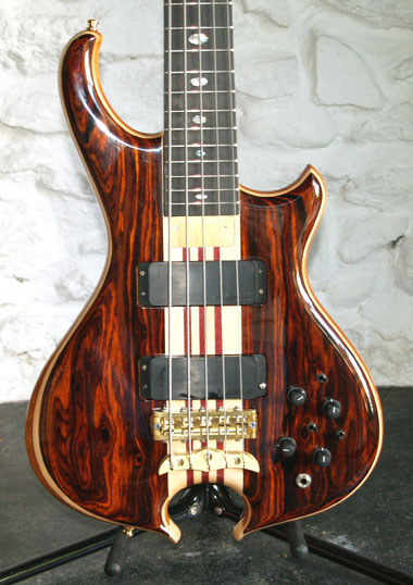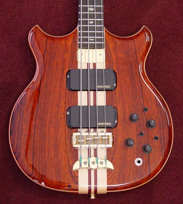 Well 72-17 is shaped just like mine. A small standard. It does not have the trapezoidal pickups, but the electronics are the same as mine and number 15. No filters, but powered electronics. The woods in the bass were darkish I remember, but I am not sure what they were now. I remember it being a long scale and it may have been a baritone.