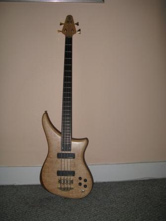 While you're waiting on a build card search, it looks like a Birds Eye Maple top on a Mahogany body, and a three piece Maple neck with Ebony fingerboard. The controls are volume, pan, bass and treble. The bass and treble controls are asymmetrical, +6dB and -15dB, centered around 100Hz and 5KHz. The logo appears to be bronze on a Maple veneer. Bridge and tailpiece are brass.