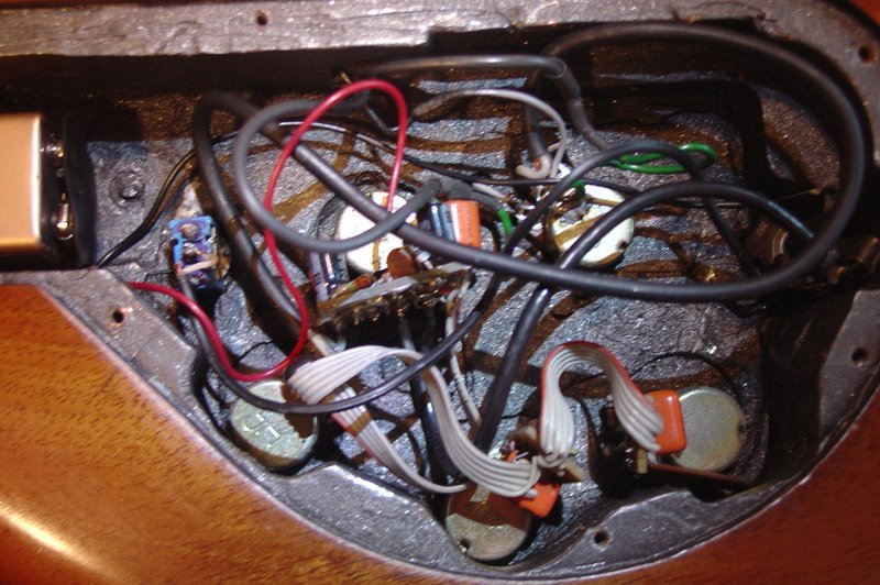 The electronics seens no original for me too. The picture below is from the cavity. It's a mess too many wires and it seens for sure not an Alembic works. The switch is for turn on/off the entire sound. It's not a bypass for the active sound. Volume, balance and three tones. I would like to recover the original wiring. It's stills sounds great, but it seens that could sounds a lot better.