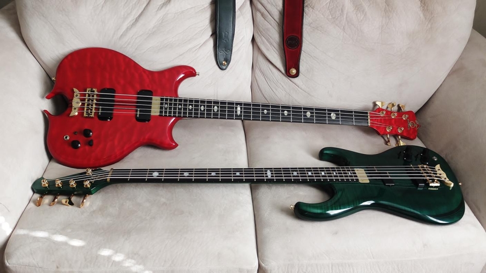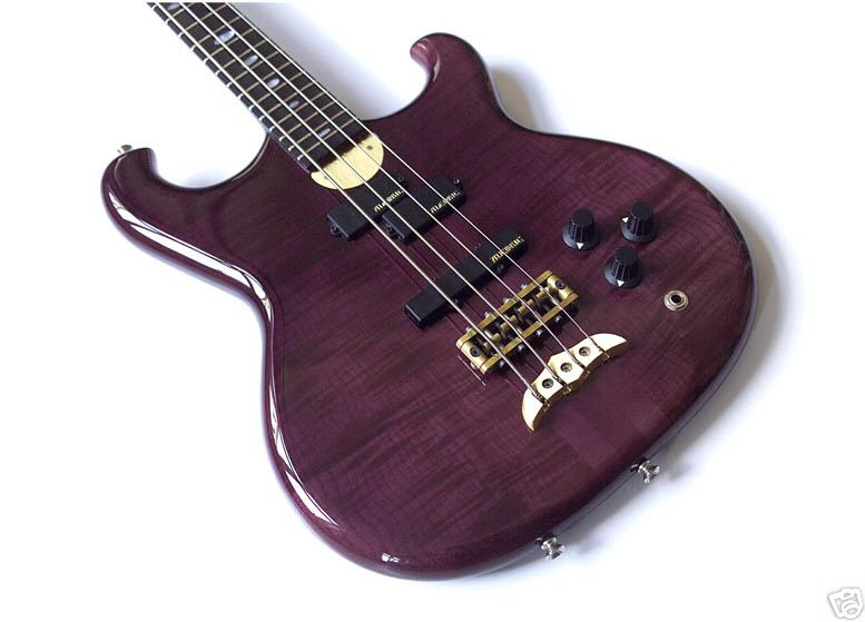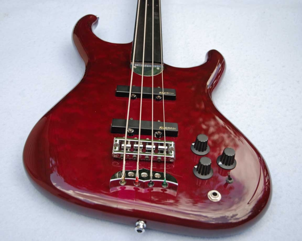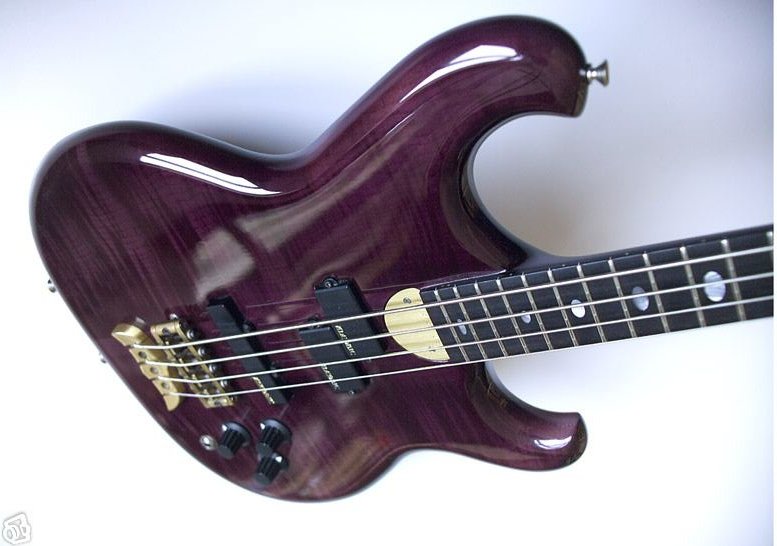 The BigRedbass is a Series-shaped (with an Omega !) in long-scale (QUITE the reach to first position) with the deluxe laminates and mahogany wings with quilt tops.  I really liked it with the AXY-4's it came with, but I love it with the FatBoy 4's I retrofitted (thanks to Mica and Bob Novy).  Very light, just a little under nine pounds (enough to where I once wondered if it was a hollowed-out Series body, but it's not), and just a little neck heavy, like all long scales in this shape.  Also Steinberger-esqe in that so much of the neck is clear of the body, ridiculously easy to play around or north of the 12th fret.  I've always toyed with replacing the rotary selector with a fader, but I really like the OFF position, so  . . . It's a '92 and ridiculously stable in action.  Bought it as a consignment here in Nashville.  My first.
