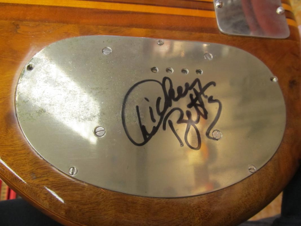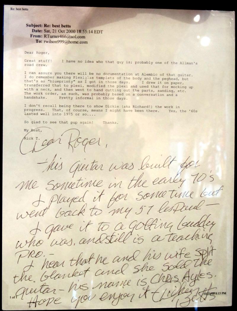 Last week I was on vacation in California starting at The Mothership, then driving up the Pacific Coast Hiway seeing sights along the way. We made a stop in Carmel By The Sea & I saw on the map that there was a vintage guitar store in town, so I decided to stop in & see what they had. To my great surprise they have a custom Alembic guitar that was built for Dickey Betts of The Allman Brothers! The guitar was built around '73/74, but I couldn't find a serial number, so it may have been a one of a kind custom hand made by Rick Turner that had no serial number. Mica can probably shed more light on the origins, but they did have a letter from Rick Turner talking about the build & in it he says there would be no record at Alembic of this guitar. on the same letter there is a hand written note from Dickey Betts telling how he got the guitar & what he did with it. The binding around the guitar is all brass & the headstock doesn't look like any Alembic I've ever seen, but it does have the Alembic logo. It is a Series I guitar & the owner of the shop said he has the DS5 & cable & that everything works on it. Currently the guitar is not for sale, but he said if he did ever sell it he would ask around $30K. The shop is Rumble Seat Music in Carmel. Their number is 831-293-8299 if you want to call & ask about the guitar. They have a nice selection of guitars & basses, so I recommend checking them out if you are ever in Carmel.