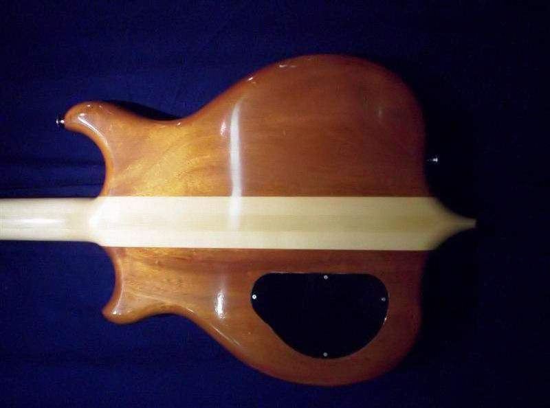 In the posted photo, I don't see any of the thick purpleheart laminations in the neck, so I'm guessing that you have the all maple laminations usually seen on a Spoiler.  Nor can I see the back of the instrument to see what the back sides of the body wings are made of.  I'm guessing the top to be possibly zebrawood, with the matching laminations on the front and back of the headstock (any better ID on this top wood, Dave?).  If you look closely at the laminations on the headstock faces, you'll see the layers they add in to strengthen this traditional fragile spot on a guitar or bass.
