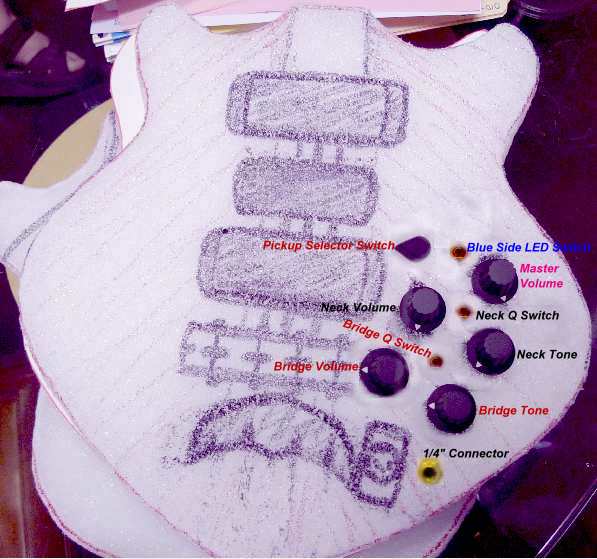 Hal, be careful what you draw.  Alembic might give you exactly what you ask for.  For example, do you really want the bridge volume pot that close to the bridge?  The five pin jack is also awfully tight to the tailpiece.  I have to assume that your diagram is just to give a feel for what you want and that you expect Alembic to alter it so that it fits within the scope of the electronics cavity and real estate available on the top.
