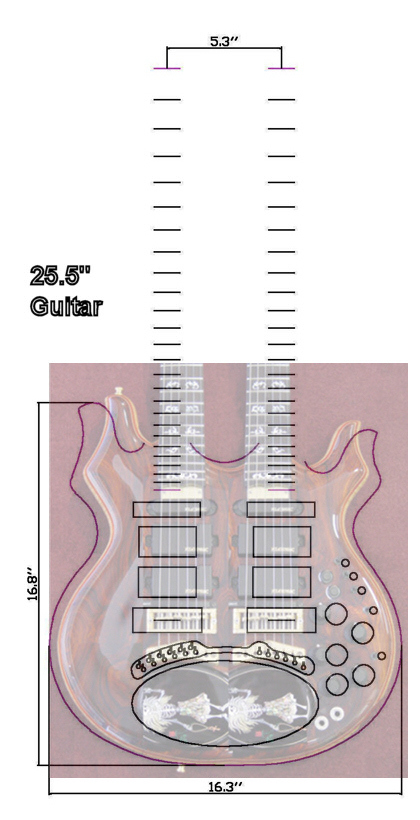 I think at this point that it would have the same scale length as the Tribute guitar.  I like the sweet shimmering sound of a 12 string.  Also, the inherent neck-dive of a doubleneck makes it quite a handful to play while standing, so I think that going to baritone scale or Bass wouldn't be practical.  As much as I LOVE the look and potential of a doubleneck Bass, It's looking less and less practical and more an exercise in guitar/Bass art.