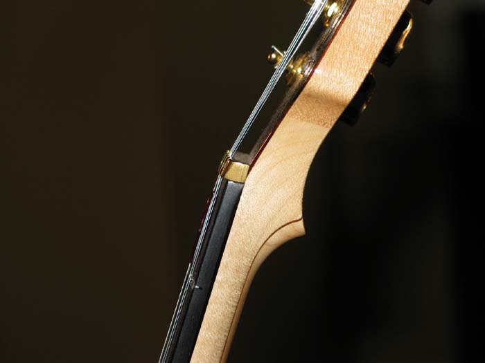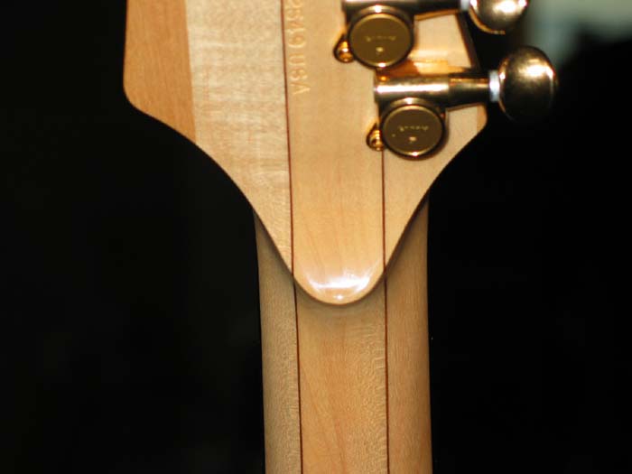 We've always used the layers of veneer to build up the strength in this, the weakest place on a bass or guitar. Our traditional methods for building the peghead use 17 pieces of wood to reinforce this joint.