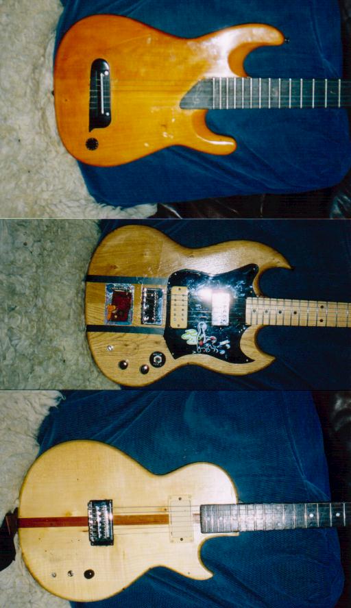 In the middle we find my re-think of a Gibson SG, this one is one of my main stage and recording guitars, it has a fatter body than a Real SG, dimarzio pickups (a DLX soapbar by the bridge and a PAF classic by the neck) a top loading non trem Fender bridge an all maple neck and a solid oak top of circa 1.5 cm thick. Also evident in the photo is the wear of the finish of heavy use, I have to patch it up some time.