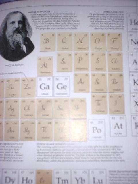 I don't know whether the cards I saw were the original ones that Mendeleev wrote out, but they looked similar to the ones that Dalton wrote out when he was working on the octects. The scripts I saw were in a Dorling Kindersley book of Chemistry for children when I was younger; I'll see if I brought the book down to Uni with me, but I think it may be at home. As for the flask design, here's a link to a simliar beaker idea which I was trying (very poorly!) to create: