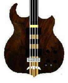 2. Custom neck-thru 4-string with Spoiler body shape, old-style Cone headstock, 34 scale and Excel elecs (single p-up) with added low pass filter and Q-switch. Neck glued in as far as possible for better balance. Ash body with zebrawood top. Chrome or nickel-plated hardware. A slapper's delight! ;-)