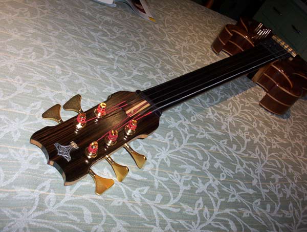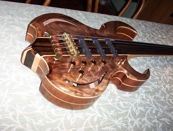 Well, since you asked so nicely...  It's an experimental hollow body electric.  The sustain, and everything else about the sound, is superb.  You can't tell from the pictures but the headstock, fingerboard, front "shim" (on the body) are from one continous piece of macassar ebony.