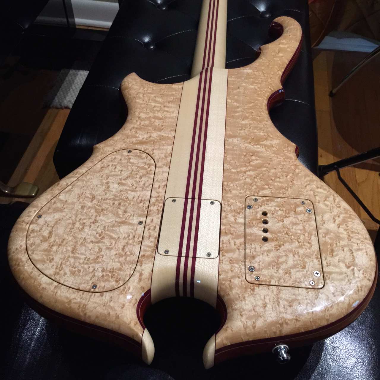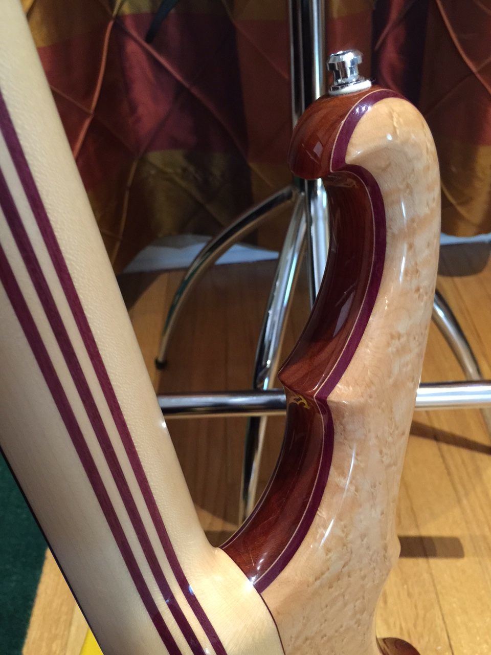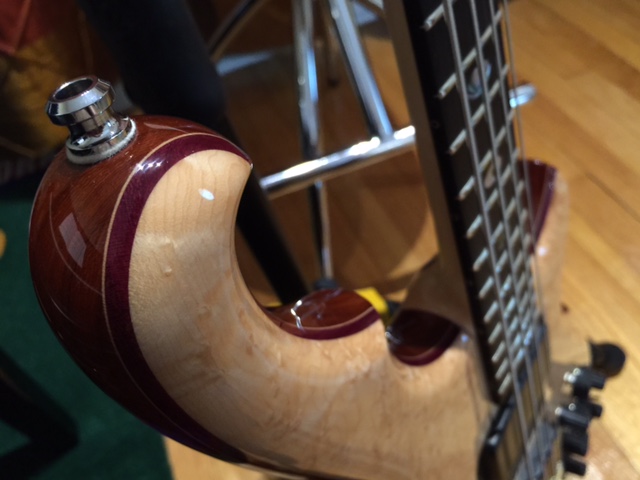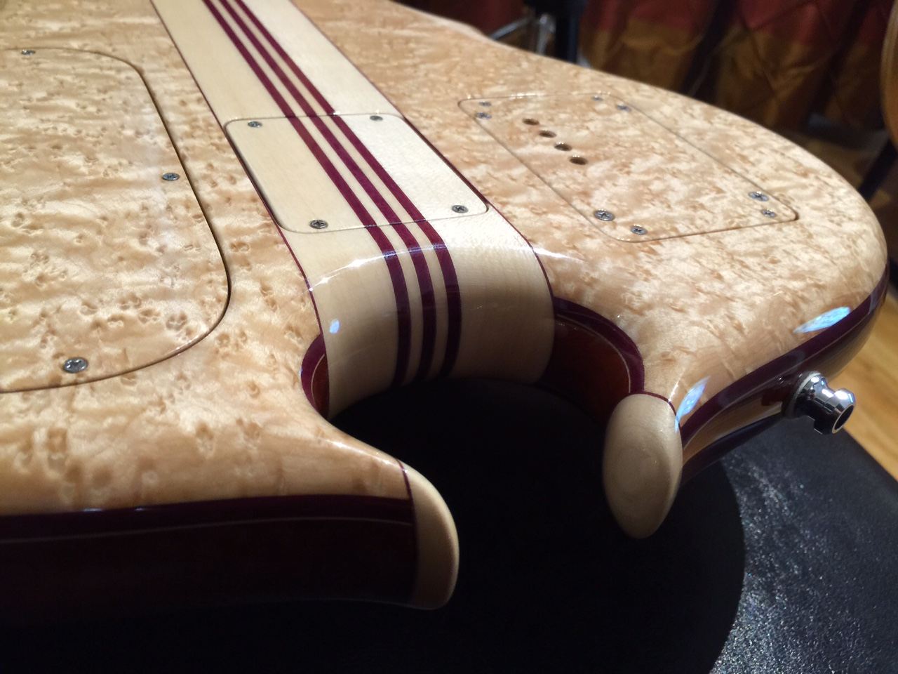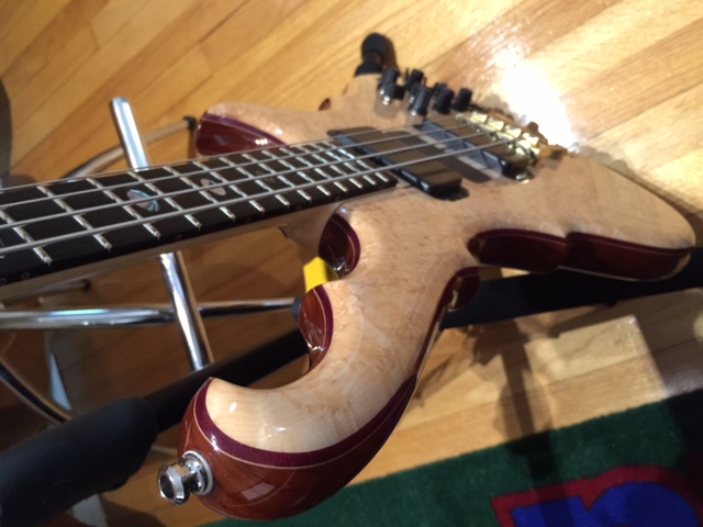 As such I landed on the BoP style because of it's more unique shape, long horn, and the added body points are useful as my ribs and my thigh fit very nicely into each of those pockets. The birdseye was chosen as my teacher/mentor Gerald Carboy (David Sancious & Tone) had a birdseye maple bass from Carl Thompson 1977. Gerald introduced me to Carl when I was 17 which was also when I ordered my very first custom bass from him at the time. So this birdseye will always remind me of Gerald.