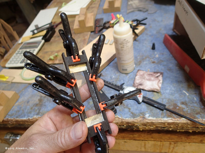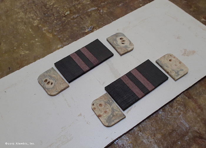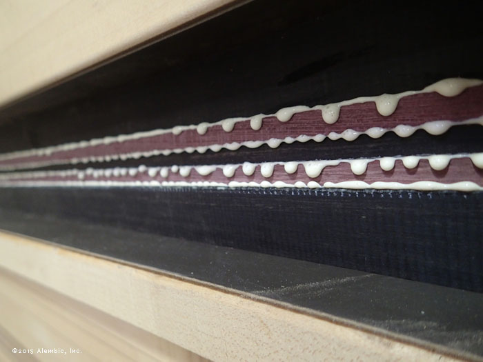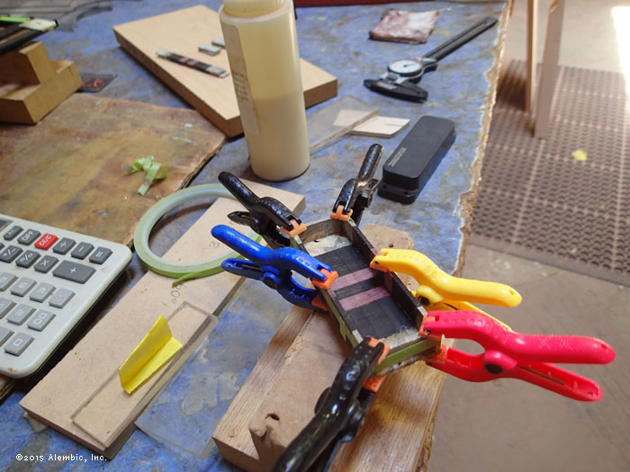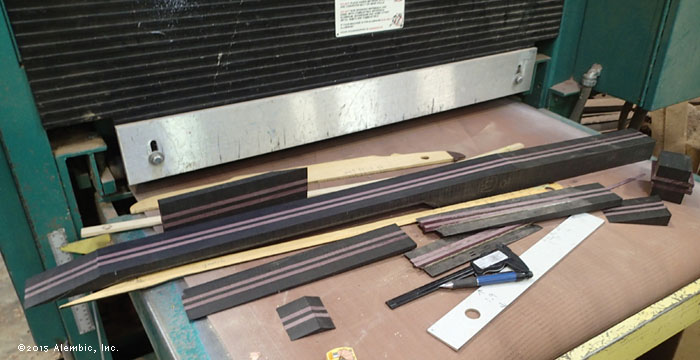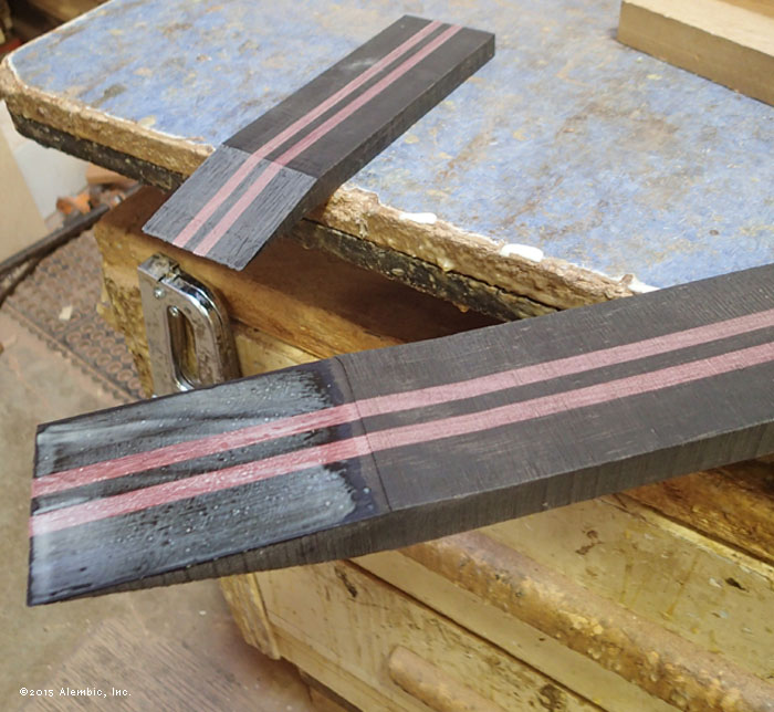 Glue-up for the neck. Striking combination of Ebony primary neck wood with Purpleheart.