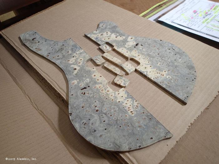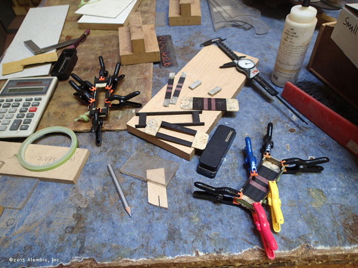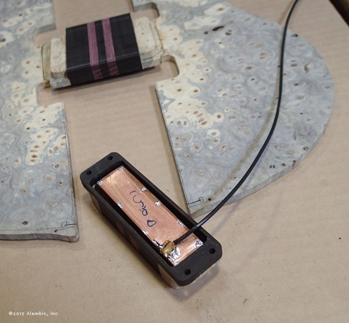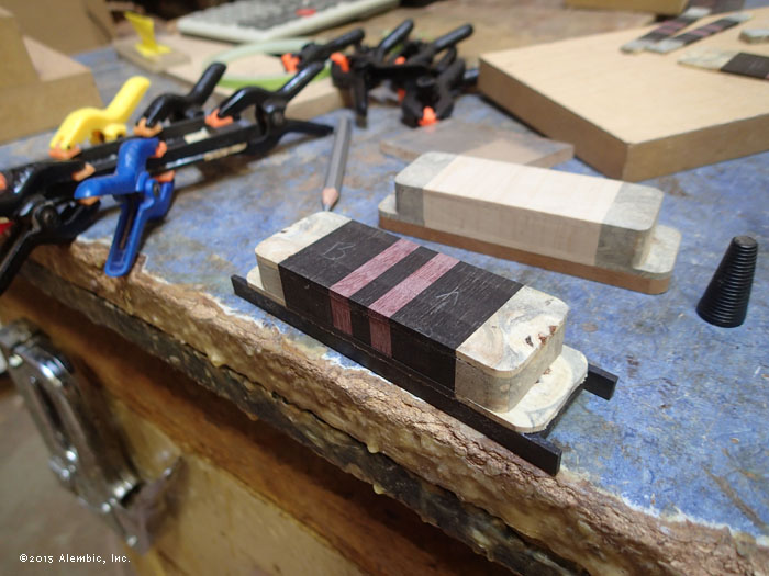 Hey look! The coil fits I spy a ramp taking shape in the background. Lining up. Body taking form. Neck to body in pipe clamps. Kris' "string of pearls" indicates the right amount of glue and pressure. That's a lot of Ebony right there! Full view of the neck to body glue up Sealing the interior of the pickup boxes with industrial epoxy (this is NOT your 5-minute hardware store stuff). This seals up the pores so the polyurethane potting compound can't squish out. Sample box on right already passed the test. Only 2 sealer coats on this bass. Holy moly! Detail of the ramp area. Continuous wood truss rod cover not installed. It's going to be a sort of long boring wait now while Bob does the finish work, but this heap of images should amuse until the bass is completed. (Message edited by mica on July 02, 2015)