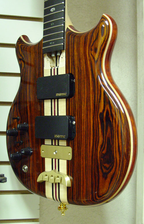 As far as the woods on my bass, I mostly will repeat to you what the folks at Alembic have told me. When I told Valentino during our first conversation that I wanted a short-scale bass with a long-scale sound, he told me that the biggest contibuting factor to the sound of a thru-body-neck bass is the neck woods, and that ebony- by virtue of being the stiffest of the woods- increases the sustain of low fundamental frequencies. Now that I have this instrument, I'm impressed at just how big it sounds for a 30.75 scale axe, and I'm assuming that the ebony is the main contributor to this.