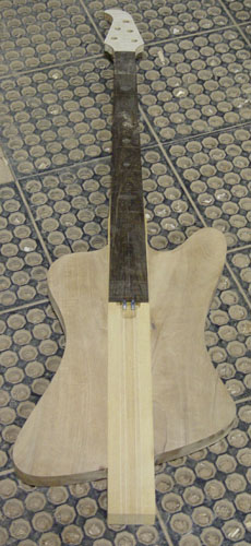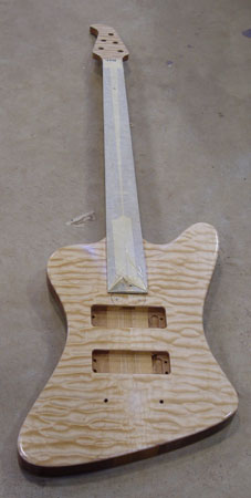 The Alembird is my tribute to John Entwistle, and it's also an homage to the Thunderbird, which is (still) my favorite non-Alembic bass. I wanted to capture some of the unique tonal qualities of the T-Bird, along with the body shape, which is why we used a mahagony neck and the T-Bird's odd pickup placement. The quilt top is really just a veneer (for the pimp factor) that won't affect the tone. It's a five string because I don't play 4 much anymore.
