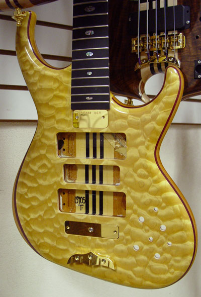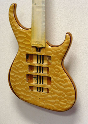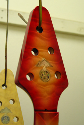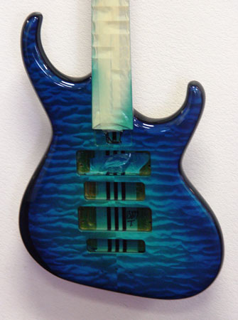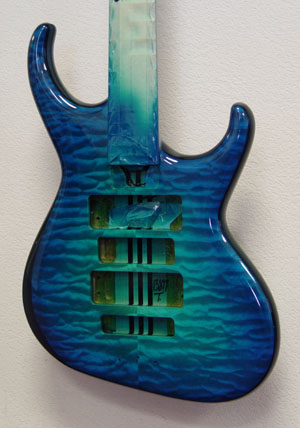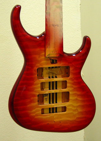 In person, the center looks much more blue, almost no green at all. I'm sure you will love it. I didn't take a picture, but the back of the body, neck and peghead are also in the burst pattern. Thanks for your vote of confidence, Steve. Bob will make the decision about the dark edge - he's so good with color/wood. Here's the cherry sunburst, but it's already back in spray to get a more amber-y center: