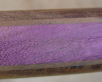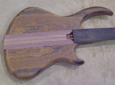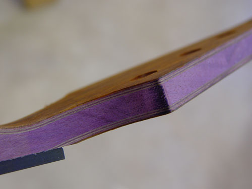 Side of peghead after rough shaping.  Don't be worried about the color of purpleheart, it's dusty from sanding. It will be restored to that crazy bright color once we clean it up and hit it with the spray.