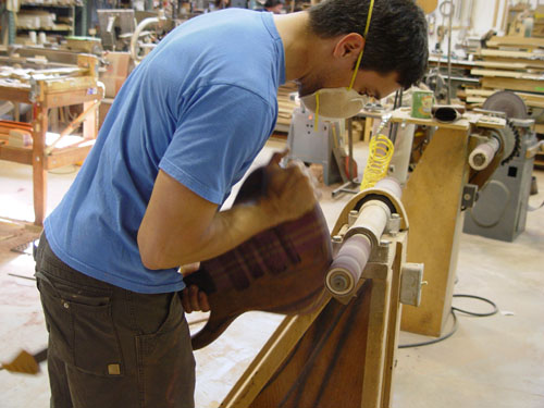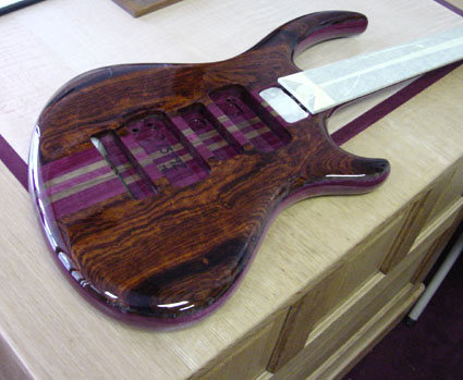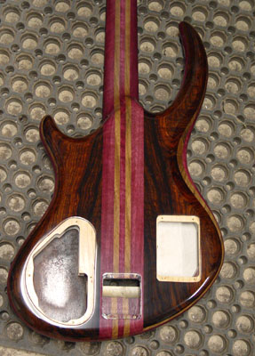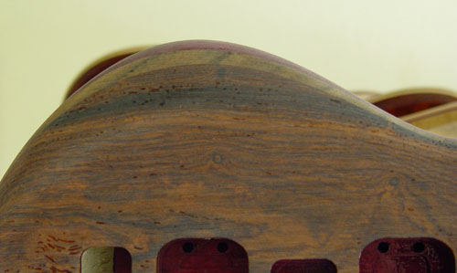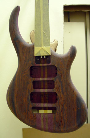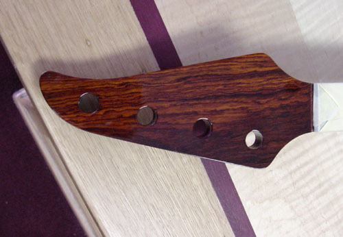 Thanks Mica,everything looks great!I'm surprised that the walnut didn't darken up as well and glad too.Like I said in an earlier post,the walnut will act like a referee to the other woods and it's doing just that.Yes this shot should do nicely for the knobs.I would ask(next time you get around to it)for a shot of the headstock so he can match the tuner buttons as well.Also I'm curious as to what the back looks like,did the evil pacmen make it onto the instrument?Did the clear coat make them diappear?Stayed tuned for the next exciting episode of.....LOL!Thanks again.Hey where's my Rogue bro's?You guys diggin on that purple?Bob the answer to your wood question is PALISANDER yuk (that hurt)!