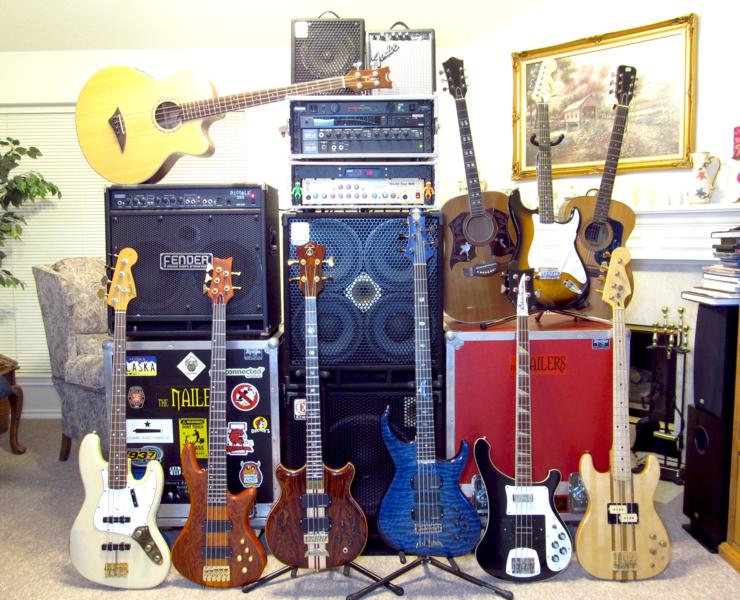 Just when I was happy with the sound I was getting from my Fender Rumble 350 with my SCSD, & glad to not be hauling my 4X10 & 1X15 Eden cabinets with my WT 800 Eden amp, now I have experienced the incredible sound of the Series II in stereo with the bridge pickup going to the Rumble & the neck going to the WT 800 & 4X10 box! The SII sounded good with the Rumble alone, but it is like it is way over compressed compared to the sound I get in Stereo. I commented to Mica that my Europa didn't have the highs that my SCSD has, but it does in stereo! It really comes alive! Currently I set my Rumble up tilted back & facing backwards like a monitor so it doesn't affect the FOH mix, but it is going to be really hard to not bring both amps & set them up in a traditional backline now that I have heard the difference in sound. I have a gig tomorrow night at one of our smaller venues & the stereo rig would be way overkill, so I will just bring the Rumble & see how the Europa sounds with the band, but if I can't get the sound I want I'm going to start bringing the stereo rig. I left the rig set up & will shoot some video tonight & post it so everyone can hear how incredible this bass sounds. I took another Family Photo with all my gear last night. The last time I took this picture I had 9 basses & guitars & that prompted my wife to say I needed one more to make it an even 10, & that got the ball rolling for building my Europa. So here is my 10.