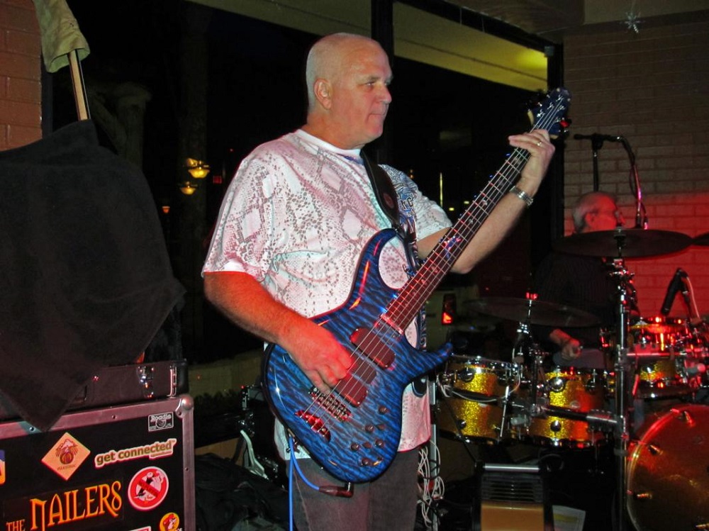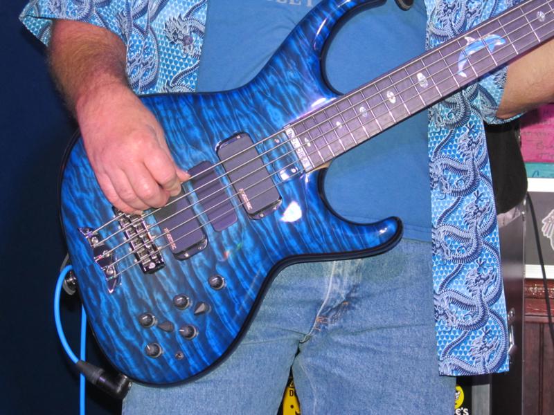 It's been really hard to capture the exact color of this bass in pictures, but the ones my wife took at my gig Friday night are the True Blue of the bass. I also bought an Ampeg BA112 to run in stereo & I now have the sound I have been looking for! I run my neck & bridge pickup through the Fender Rumble 350 in mono & my bridge pickup through the Ampeg to enhance the mids & highs. The Ampeg is only 50 watts so it is not adequate to run full stereo & compete with the 350 watt Rumble, but thankfully Ron, in his infinite wisdom built the DS-5R where the treble jack is still hot even in mono mode.
