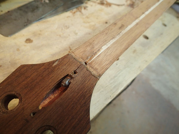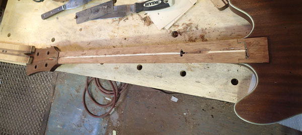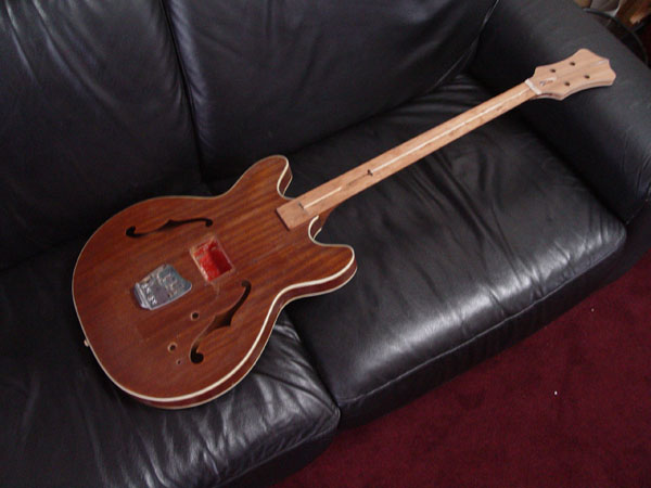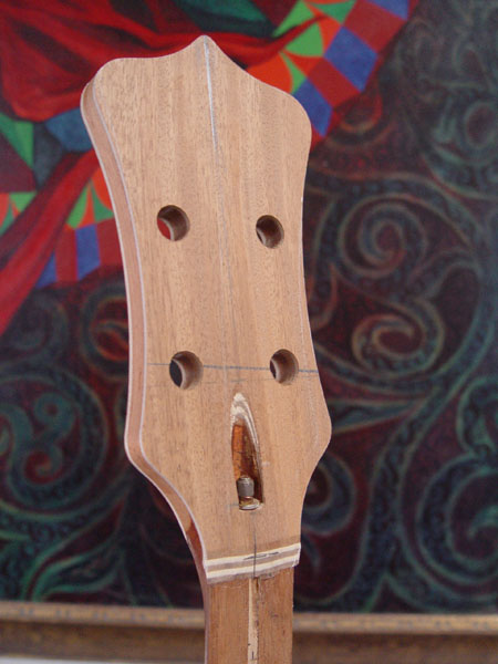Peghead should get glued up next week. More to come.    I sent a scrap tailpiece to you. Let me know how that project works out. And you wanted some numbers, so here they are:  ################################################## id = moonliner scale length = 30.75 string dia. 1=.045 2=.065 3=.080 4=.105  at nut end:       fingerboard width = 1.5   treble edge allowance = .15     bass edge allowance = .15    string center 1 to 2 = 0.375    string center 2 to 3 = 0.375    string center 3 to 4 = 0.375 spacing between 1 and 2 = 0.32 spacing between 2 and 3 = 0.3025 spacing between 3 and 4 = 0.2825  at bridge end:   treble edge allowance = .15     bass edge allowance = .15    string center 1 to 2 = 0.675    string center 2 to 3 = 0.6925    string center 3 to 4 = 0.7125 spacing between 1 and 2 = .62 spacing between 2 and 3 = .62 spacing between 3 and 4 = .62     string edge to edge = 2.155 (projected) fingerboard width at bridge = 2.455  fingerboard width at nut     = 1.5 fingerboard width at 24th fret = 2.21625 fingerboard width at 25th fret = 2.22965000784725 fingerboard length             = 23.4939662212595 ##################################################  Of course, your bass only has 21 frets, and this is ever so gently wider than the original with a touch of fingerboard flaring like we discussed.