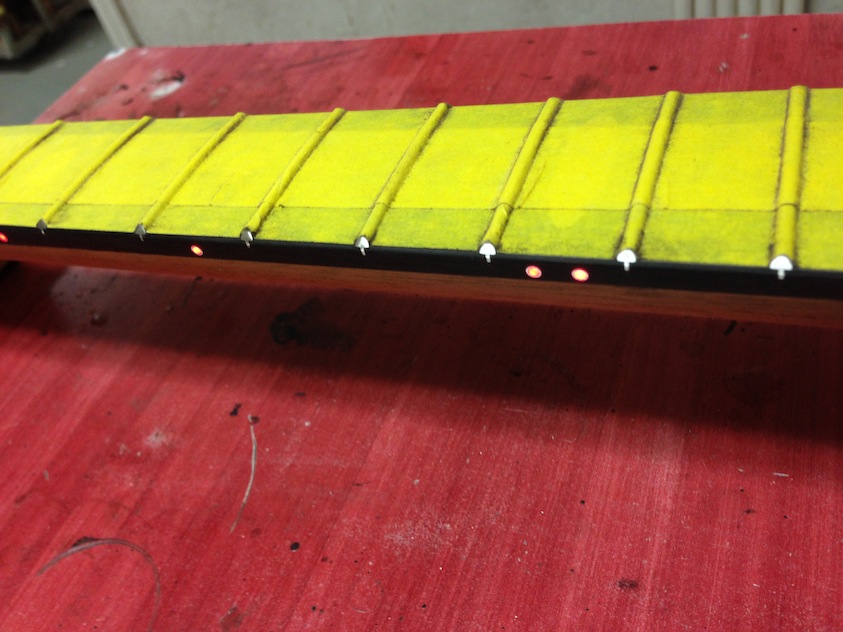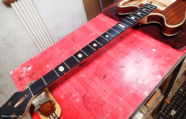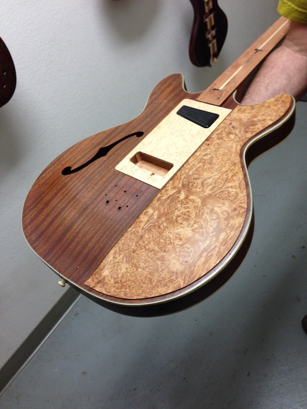 Gold mother of pearl inlays going in tomorrow, then the frets.