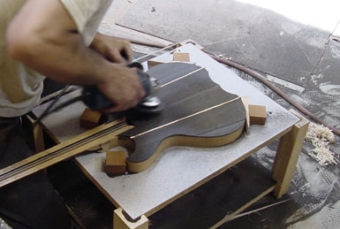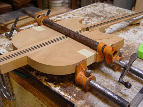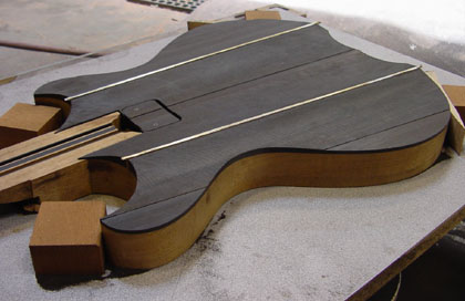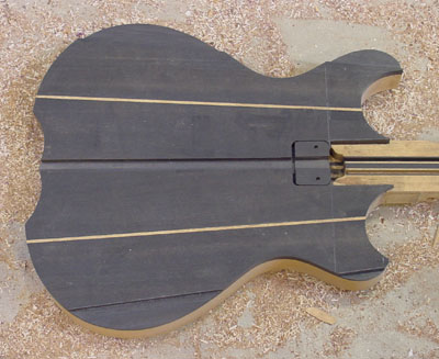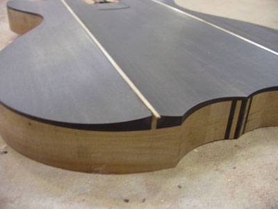 The fingerboard is now in place, and the bass is ready for routing, should be on Thursday. That little gap between the truss rod cover and the cavity is where one of your pickups will be. Mike arranged it so that when Bob routs it, the truss rod cover and the cavity will be trimmed at the same time. Pretty slick, huh?