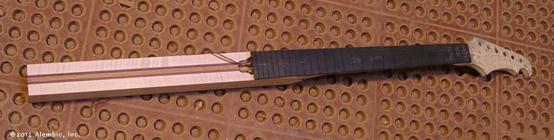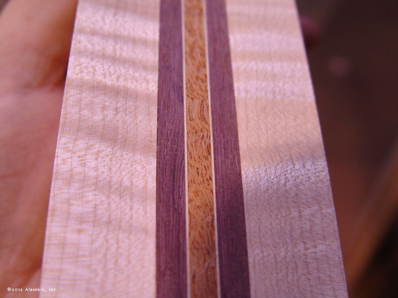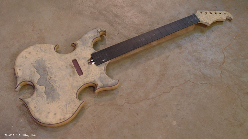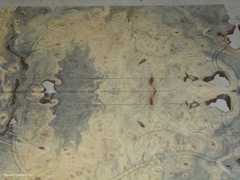 Looking good so far, John! That's an amazing piece of wood you chose, and the continous back will be amazing. I hope I was of some help with the knobs; one thing you need to decide on, though...as you can see above, I chose the 'skirted' design. Roger offers different shapes and heights of knobs, so think a bit & decide what is best for you & your playing style. The skirted type are slightly fatter & taller than the standard-issue black knob, but easier to grip (IMO).