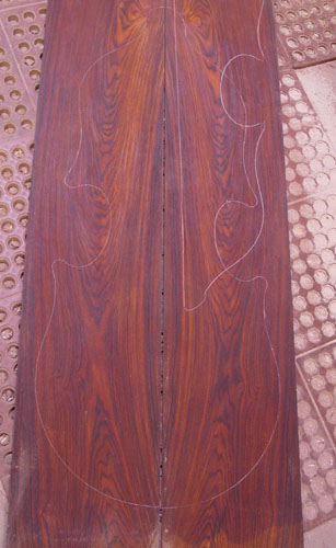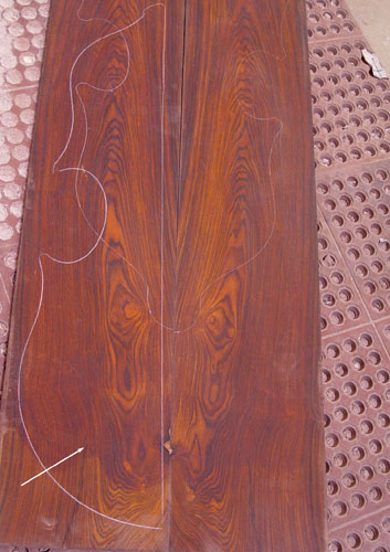 Would have to move the template up to miss the crack I marked, but at least you can see the template in scale with each direction and be able to make your choice with a picture reference. Kris and I started pawing through the large Coco Bolo planks today just to make sure nothing else is hanging out there that would be even better for your bass. Should be finished with that task tomorrow. In a matter of days the wood and glue will be flying all over this project, and I will be taking many photos for you. I'll post a wood report by Friday so we know from what we have to choose.