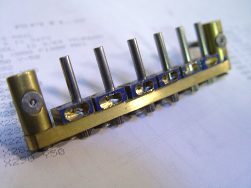 When these are back from the gold plater (hopefully next week) we'll solder the RMC saddles en place. BTW, this is NOT the rail for your bridge, since yours is concealed hardware. When the bridge is all assembled, I'll post another picture before it's mounted to show how nicely the whole thing comes together.