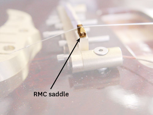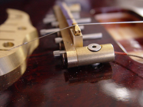 We've machined a pocket in our saddle, and are anchoring the RMC pickup in that pocket. This was just a test fitting, and there's more sculpturing to do to the saddle to make it look better - but this a vast improvement over the hobby-esque first version.