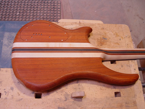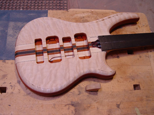 Actually, it's neither Series I OR Series II! This bass will utilize Series pickups, a PF-6 card and a side-mounted 5-pin jack, but from that point, it strays WAY off the reservation! It's what it WON'T have that makes it rather unique. Namely, this bass won't have: 1. any on-board filters or Q controls (I'll be using a Superfilter for those duties instead; in conjunction with an F-1X and, of course, a DS-5 power supply), 2. any batteries (outboard powered exclusively), 3. any 1/4 jack, and 4. any pickup selector switch (or pan-pot, for that matter). What it WILL have for controls will be: 1. Master Volume, 2. Neck pickup volume, 3. Bridge pickup volume, and 4. Side LED fader control knob....and that's IT! Admittedly, not everyone's cup of tea, but it works for me! For over a year, I've been using a custom bass with Elan electronics (with the filter set full up to the 6Khz point, and the Q-switched off) through a Superfilter configured in Stereo mode and wired in Series (bass output to Channel A FRONT-panel input (Channel A in Hi-Pass mode); Channel A output to Channel B input (Channel B in Low-Pass mode); Channel B output to F-1X f/x return jack (yes, it works as a rear panel input); and F-1X XLR direct out to the Channel A Balanced input of a QSC power amp configured in Bridge mode with the channel inputs internally paralleled as well. In the paralleled inputs mode, the Channel B XLR Balanced input functions as a Balanced OUTPUT, so, when I need to send a signal to a Mixer, I use THAT for the job (and pad it down with a Shure in-line switchable attenuator as needed).