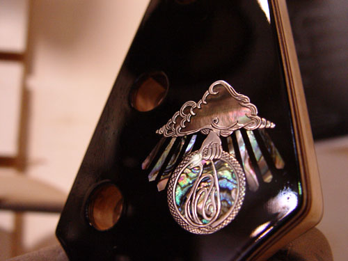 The colors in/of the BMP Logo inlay are stunning! The rays add additional character and beauty. Really like the placement and how much it stands out against the hi-gloss black lacquer, (ebony), background too.