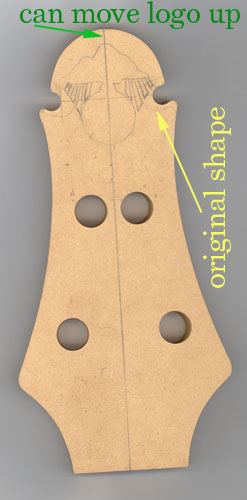 The peghead shape is perfect.  You should move the logo up to the tip of the green arrow, splitting the difference between the top of the peghead and the cloud top's current position.  The rays will look best with a longer length, the longer the better.  I apologize in advance for the inconvenience of sanding inside those small cutouts!