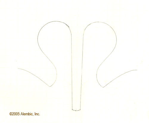 Pete will be ready to carve your bass tomorrow, and we find there is some clarification needed on the bottom carving. The order states "Heart Omega" but we keep drawing stingers for it. I think the bass is trying to tell us something. Anyway, here's Chip's sketch of the 4-string stinger: