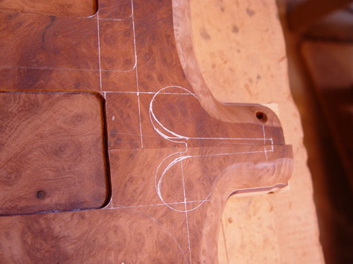 The Mahogany inserts are just to keep things nice while scraping - they aren't part of the finished bass.  Anyway, get back to me on the carving detail so the chips may fly tomorrow.