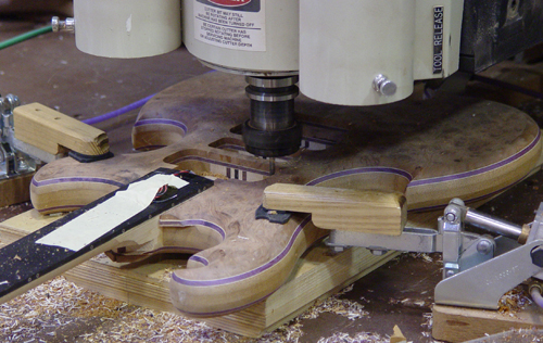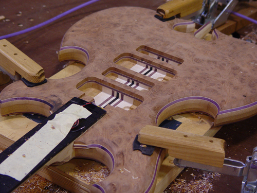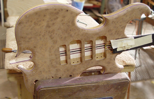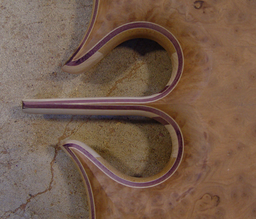Wow!  The idea was to create the illusion of a thin tapered stinger and you nailed it.  The burl top lam and the maple pinstripe are needles!  Nice goin' Peter!  The stinger is still substantial though, with a butcher block end.  I think there's an ebony neck lam hidden in there somewhere.  The purpleheart accent lam was Susan's idea.